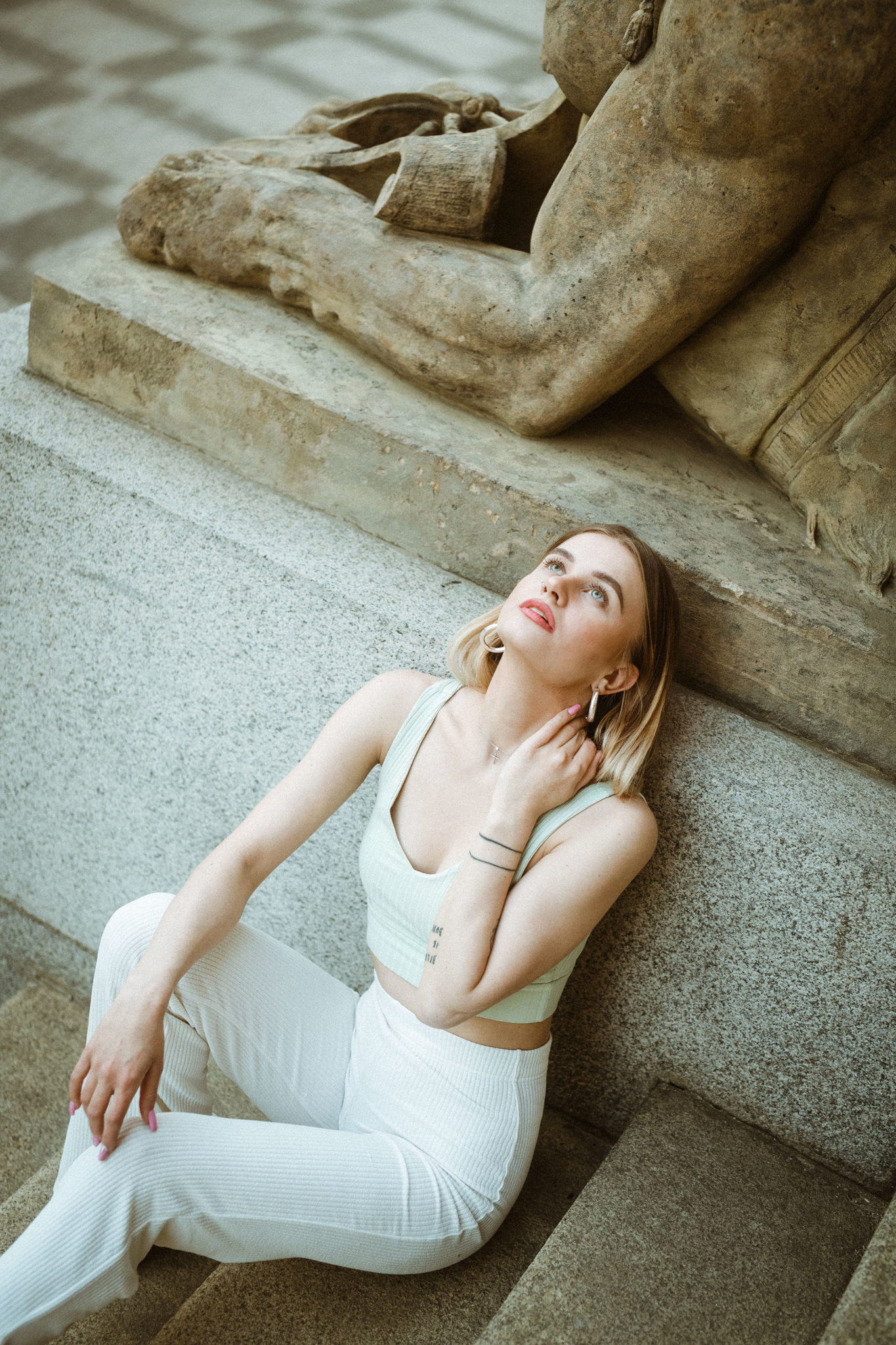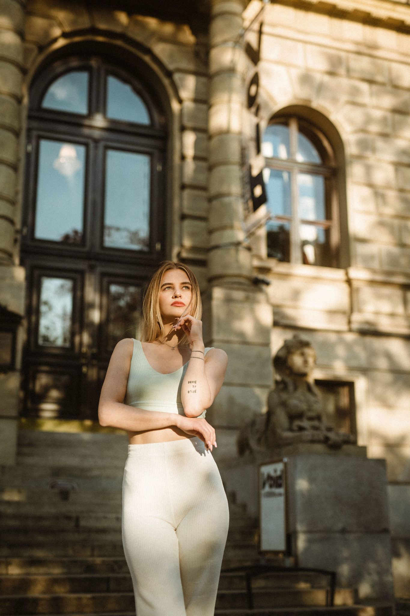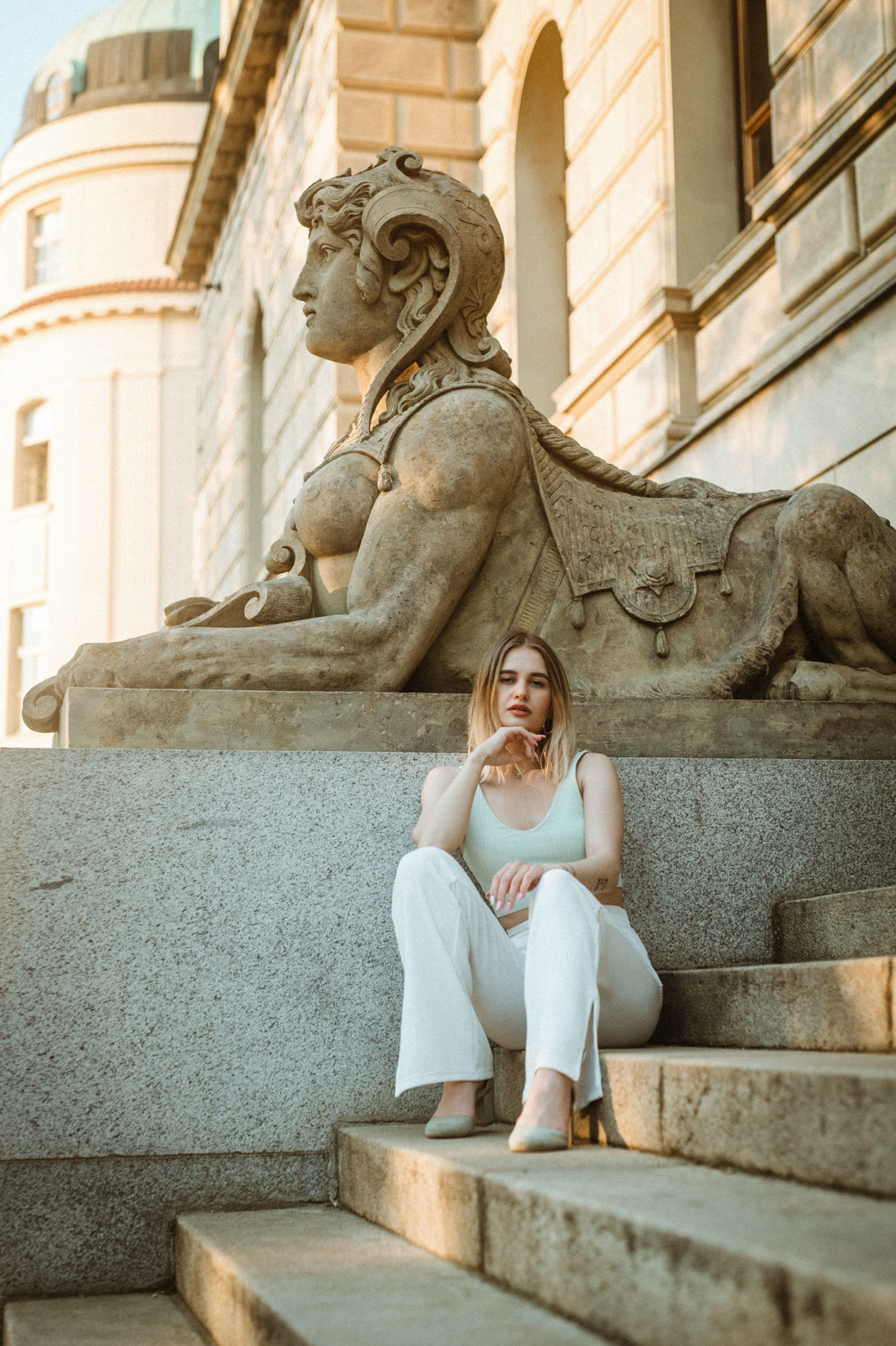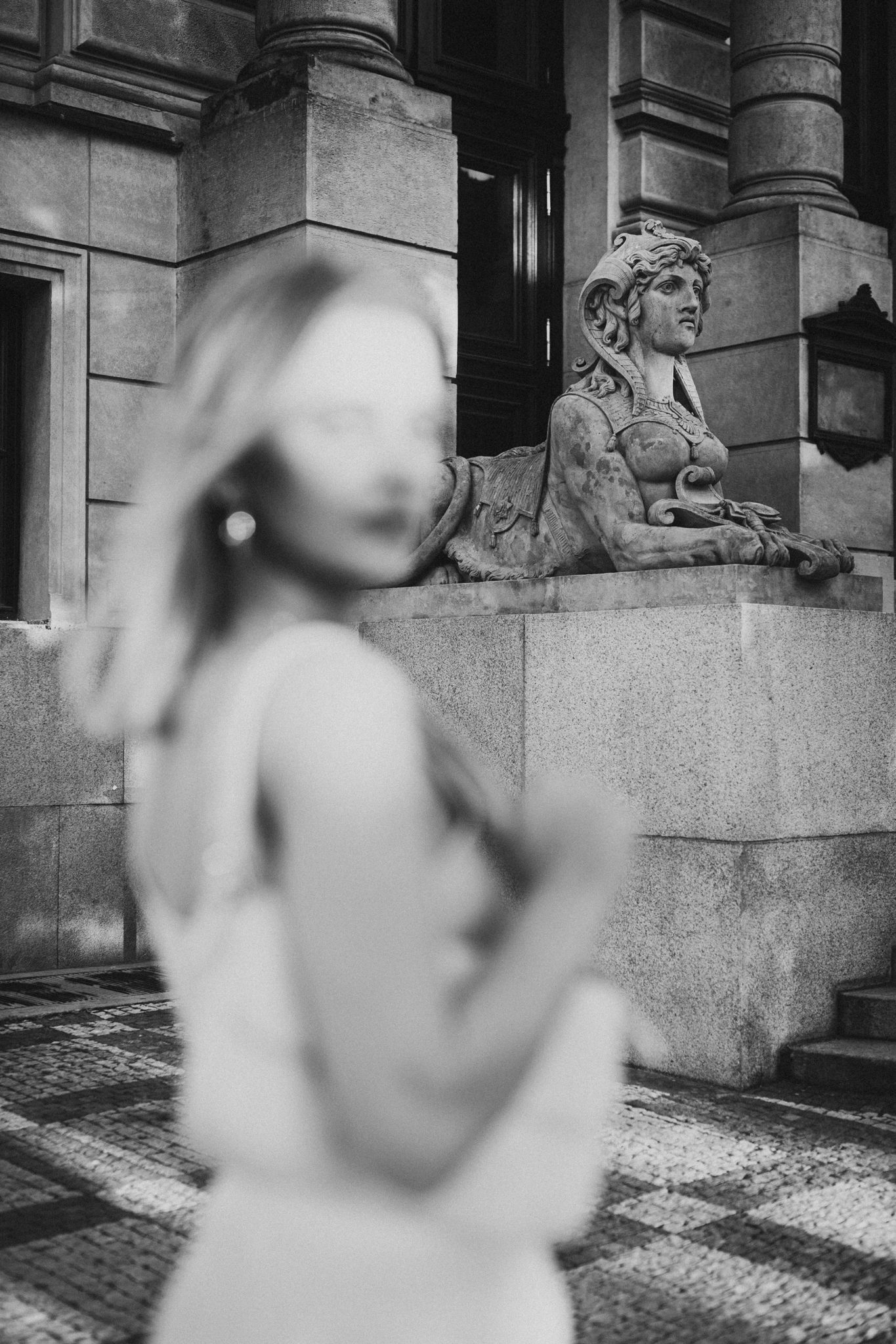 Rudolfinum, zlatavé světlo a sfinga pluje Prahou.